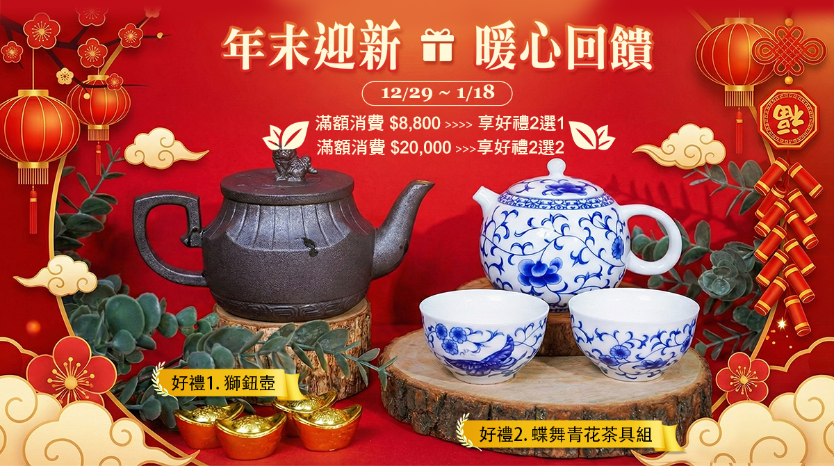 ⓵消費滿 8800元 贈 好禮二擇一【❶鐵質還原燒獅鈕壺/❷蝶舞青花(一壺二杯組)】
